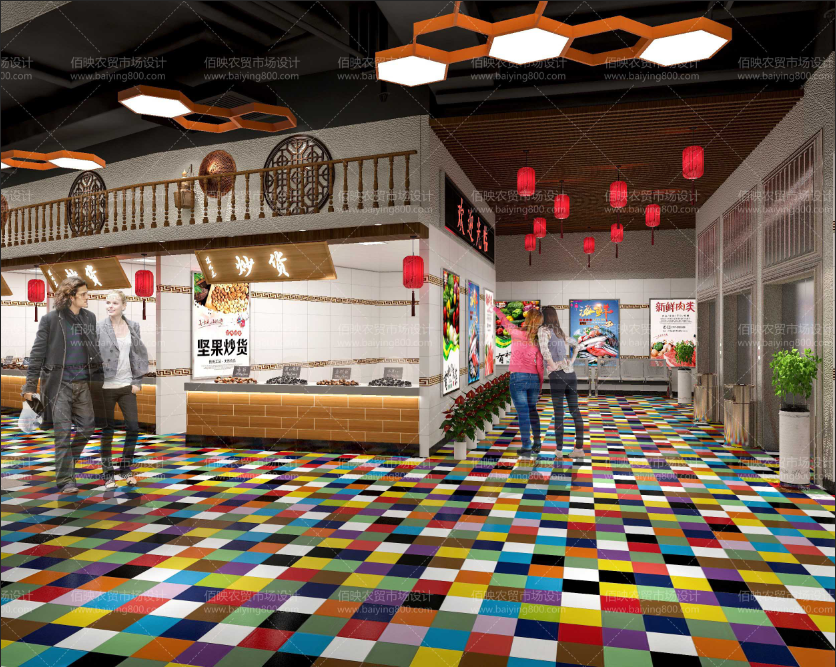 市场区域采用彩色地砖,配合斗笠蓑衣和畅游小鱼的造型,让人仿佛置身于斑斓的海洋之中,尽情遨游。