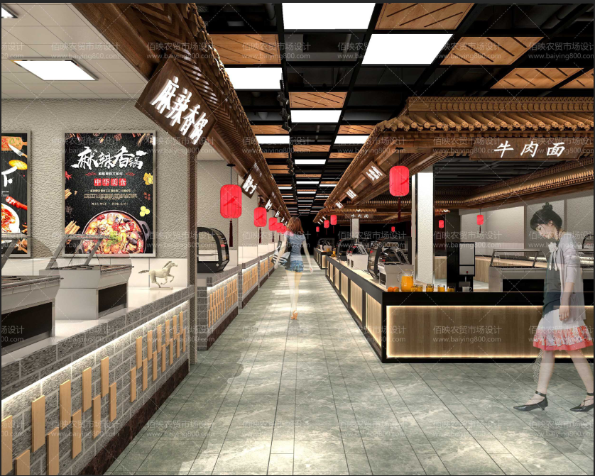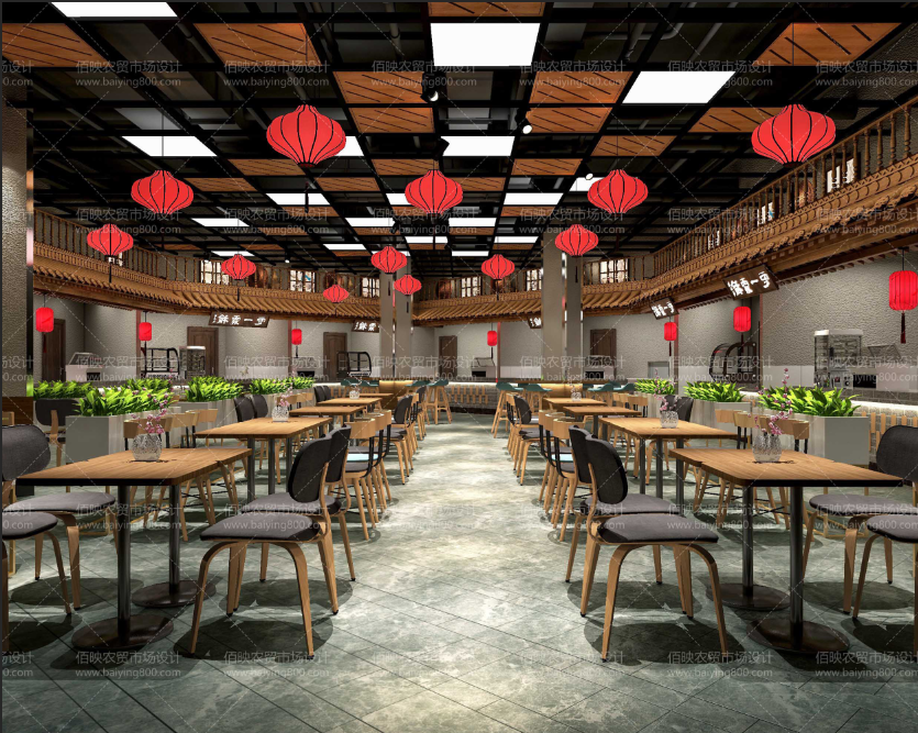 古色古香的美食档口,深沉有质的公共餐桌椅,在这里不仅能吃到美食,还可以品味古典的雅韵。