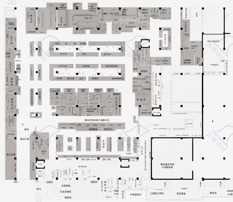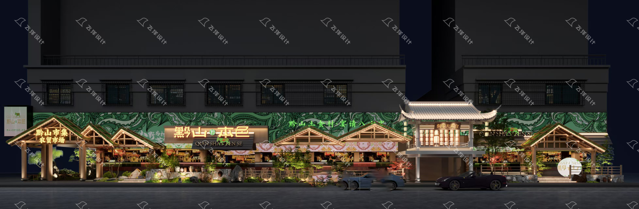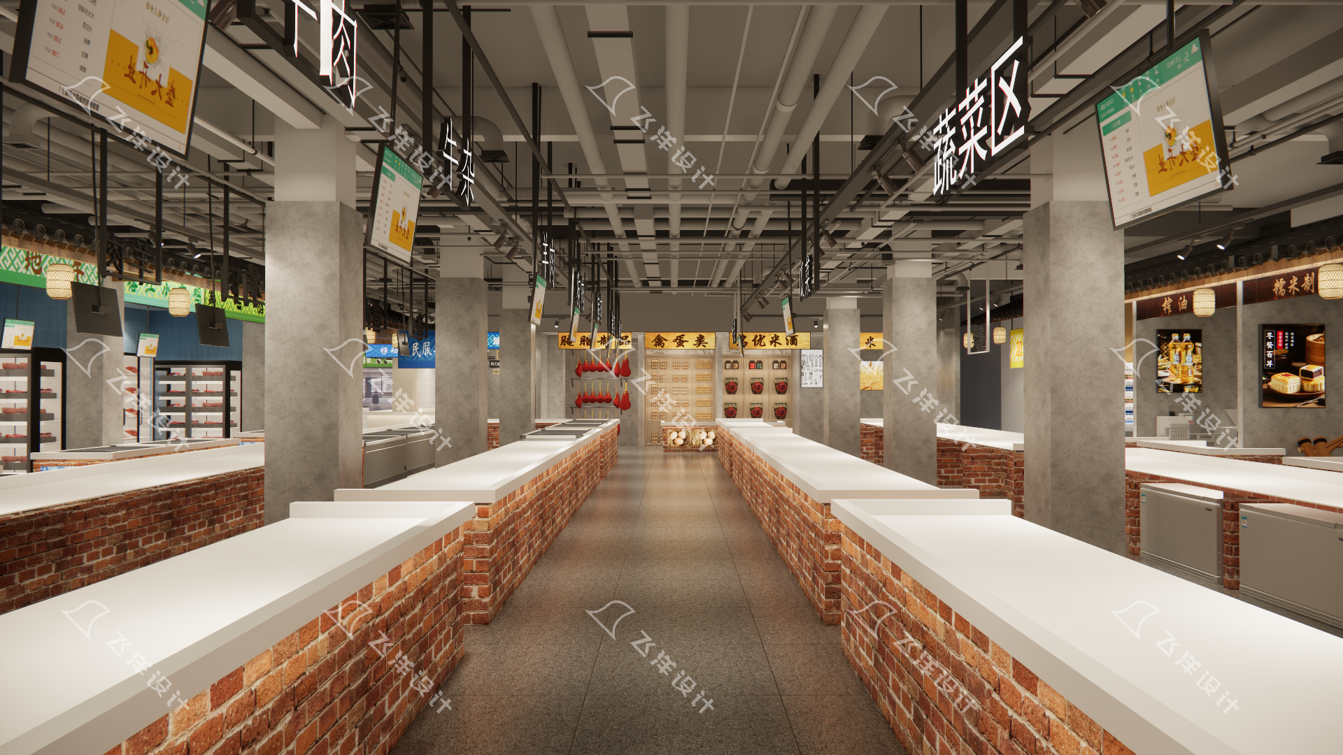 黔山市集原址为贵州凯里三商场半地下室空间,前门位于负一层,后门连通地面一层,是连接城市不同标高的特殊商业体。本次改造以亮点吸引直达动线、规避半地下室交通闭塞为主要矛盾解决思路,以"胖东来"服务理念与品质标准为蓝本,深度融合黔东南苗族侗族文化元素,通过品牌化、精品化、体验化的全面升级,打造集在地农产品展销、民族手作体验、特色美食加工于一体的区域性农贸标杆,让传统市集成为展示贵州风物的重要平台。