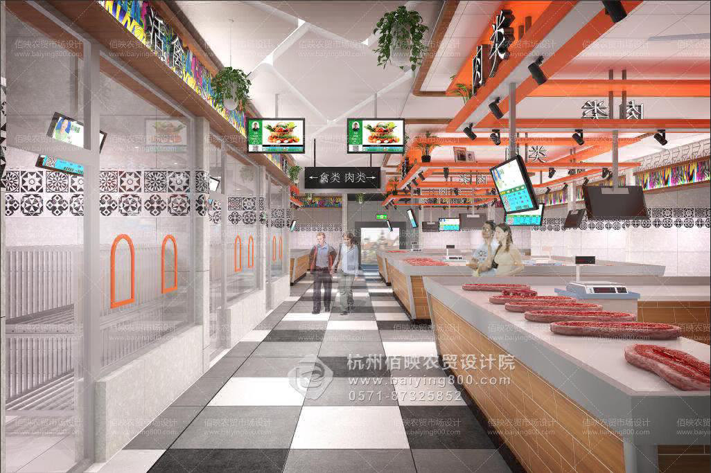 肉类区采用橙色吊楣,吊楣底部设有LED生鲜射灯,更好地呈现食材的色泽和质感,渲染食材的新鲜度,调动顾客的购买欲。活禽区严格实行三重隔离设计原则,并且配备独立排风系统,让整个市场毫无禽类异味。