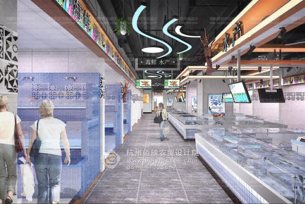 水产区顶部喷深灰色油漆,搭配蓝色流线型LED灯具,如同波纹一般。水产摊位外立面贴蓝色瓷砖,台面上则设有玻璃鱼缸,能充分展示鱼类鲜活,方便顾客挑选水产。营业房内则砖砌养鱼池,并贴上蓝色马赛克瓷砖,与水产摊位相互呼应。