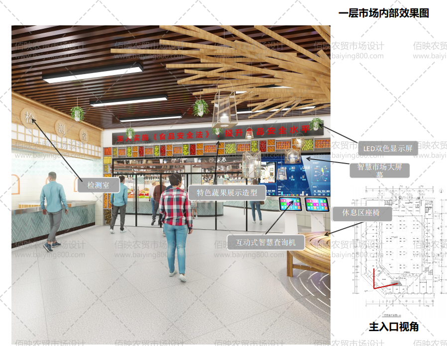门厅亦是一个建筑的面子工程,作为市场的门厅,要求宽敞大气、容纳更多进出的顾客,还要将农贸元素得以展现,特别是农贸公益服务设施(如检测室等)应设置在门厅附近显眼位置,把顾客体验和顾客服务置于首要位置。