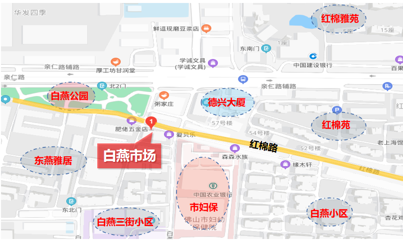 白燕市场地处佛山市禅城区,位于红棉路旁,临近主干道,交通便利。辐射范围内有多个小区居民楼,世南家园、红棉苑、东燕雅居等,属于居民购物买菜、购物、娱乐、日常消费的重要场所,是“家门口的菜市场”提升改造工程典范。