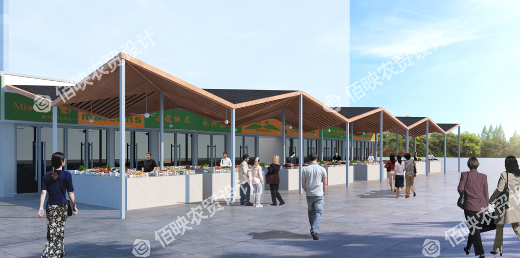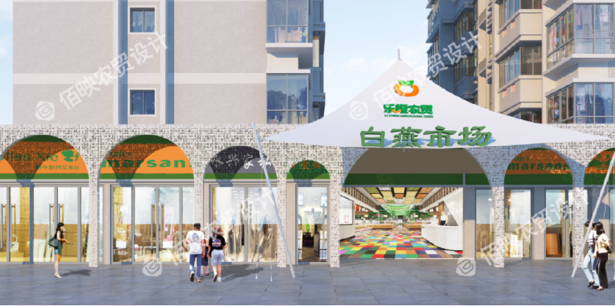 在尽可能保留原有棚顶入口形象的前提下,复原出更大气明快的门头造型,以类“帆布”造型突出乐橙农贸的运营品牌及市场名称,且暗含一帆风顺的隐喻。既不失改造前老市场的神韵,又在此基础上大突破创新,是一次出彩的门头设计。