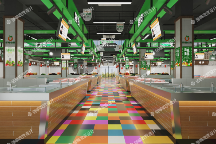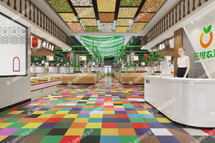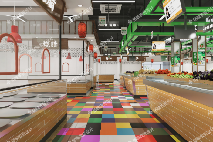 宽敞的摊位设计便于各类食物的陈列,利于消费者的选购,划行规市设计将同类经营业态相对集中,规范商业经营行为,培育专业市场,发挥规模效应,发展特色市场,改善市场环境,提升城市品位。灰白的亮色瓷砖和市场风格搭配,让设计更显整洁明亮,且商业氛围感浓厚。