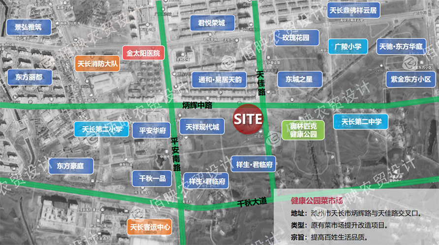接到设计任务后,佰映公司派专业设计团队赴现场进行调研走访,充分了解现状,以及对周边同类市场进行数据采集,用于精确定位健康公园市场的改造目标、业态构成。