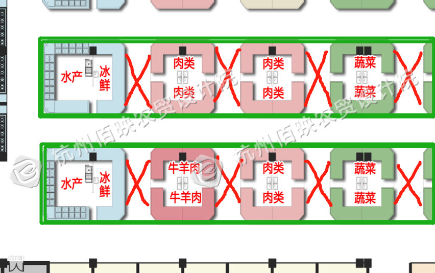 (如图所示,取消所有摊位与摊位之间的纵向通道,只保留横向通道,变相让摊岛变成长条形状,从数据上确提高了得房率,降低了公摊)