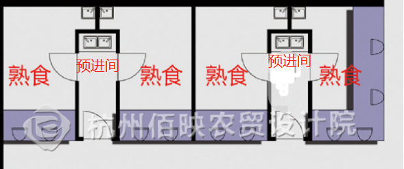 (如图所示,为4个熟食营业房,共用2个预进间的巧妙规划。相对于每个熟食营业房分别设置预进间的标准化做法,节约了2个预进间的公摊面积)